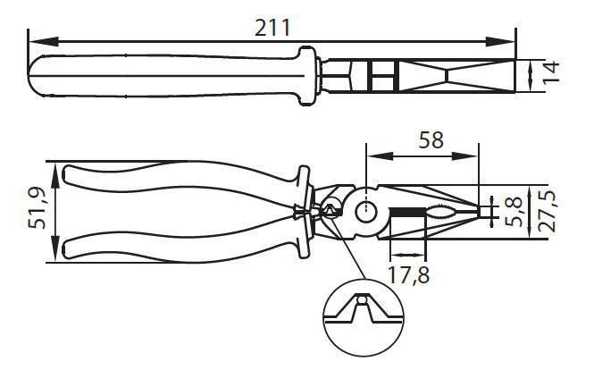 Com ajustes controlados para melhor desempenho do corte, o alicate possui o corte tipo topo e corta fios e malhas de cobre sem deixar rebarbas. Ele também possui um dispositivo para prensar terminais de bitolas de até 10 mm² sem isolação e bico com ranhuras cruzadas para melhor agarre de fios e capas isolantes.