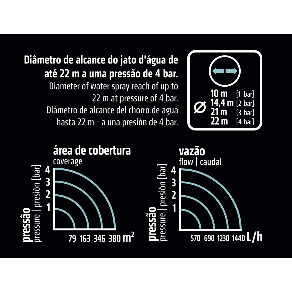 - Tem uma área de cobertura de até 380 m² ou diâmetro de alcance do jato d'água de até 22 m a uma pressão de 4 bar.