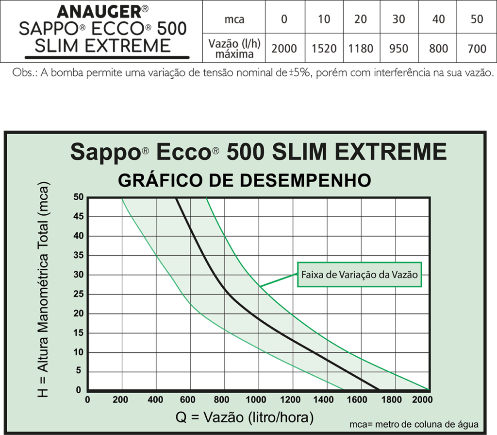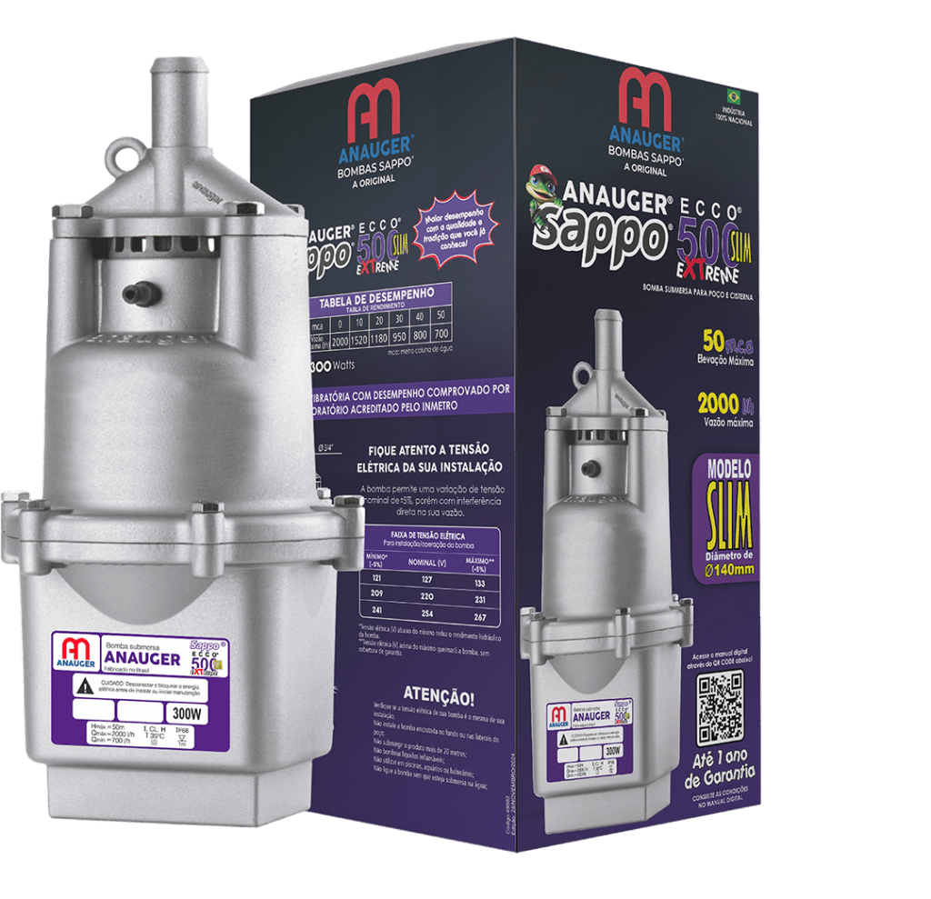 A Sappo Ecco 500 Slim Extreme da Anauger é uma bomba submersa vibratória ideal para poços com diâmetro superior a 7 polegadas (180 mm). Com potência de 300W, atende com eficiência aplicações em residências, irrigações, pequenas criações e indústrias, elevando água com qualidade e economia.