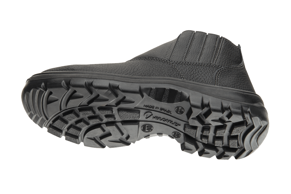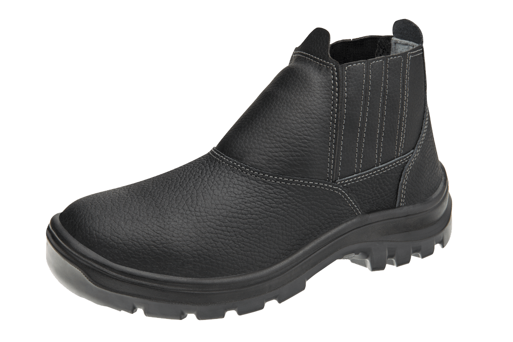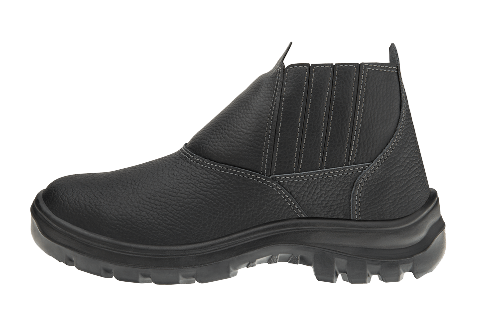 Esta Vulcaflex tem biqueira de polipropileno ou aço e fechamento em elástico nas laterais. O solado em PU bi densidade tem sistema de absorção de impacto, sendo injetado diretamente no cabedal. A Marluvas oferece este calçado com palmilha de aço ou montagem em EVA.