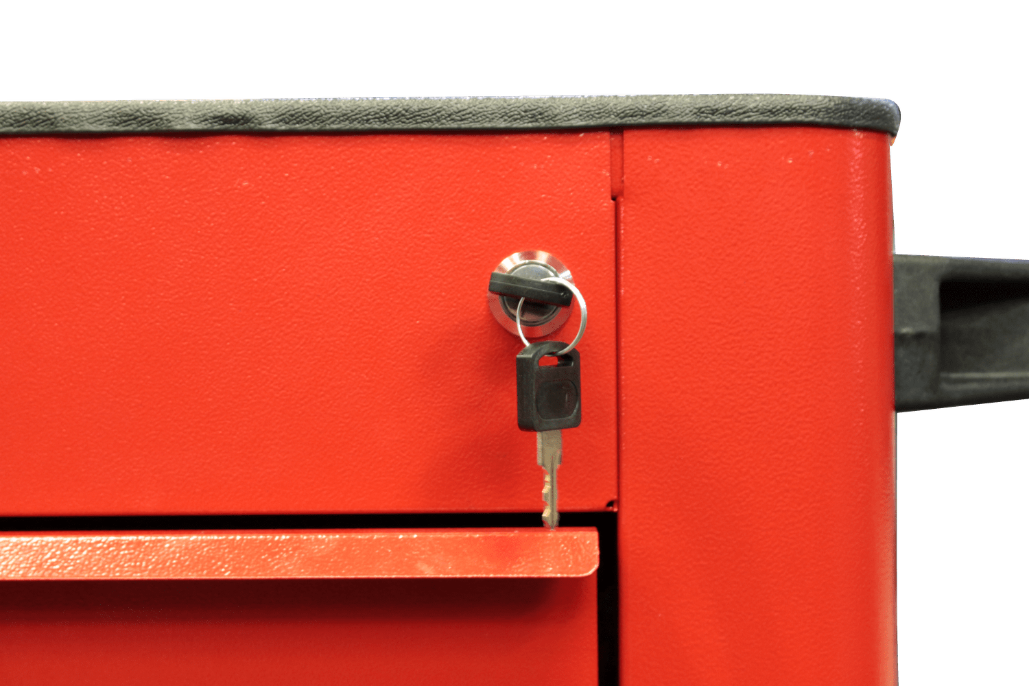 › Estrutura e gavetas com acabamento em pintura na cor vermelha padrão GEDORE Red e puxador na cor preta.