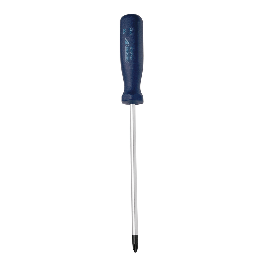 Haste em aço Vanádio e cabo em polímero na cor azul padrão Gedore. Haste com acabamento niquelado e cromado, com ponta escurecida. Cabo ergonômico. Chave com haste redonda e resistente, com perfil de encaixe para parafuso tipo fenda Philips. Encartelada para autosserviço.