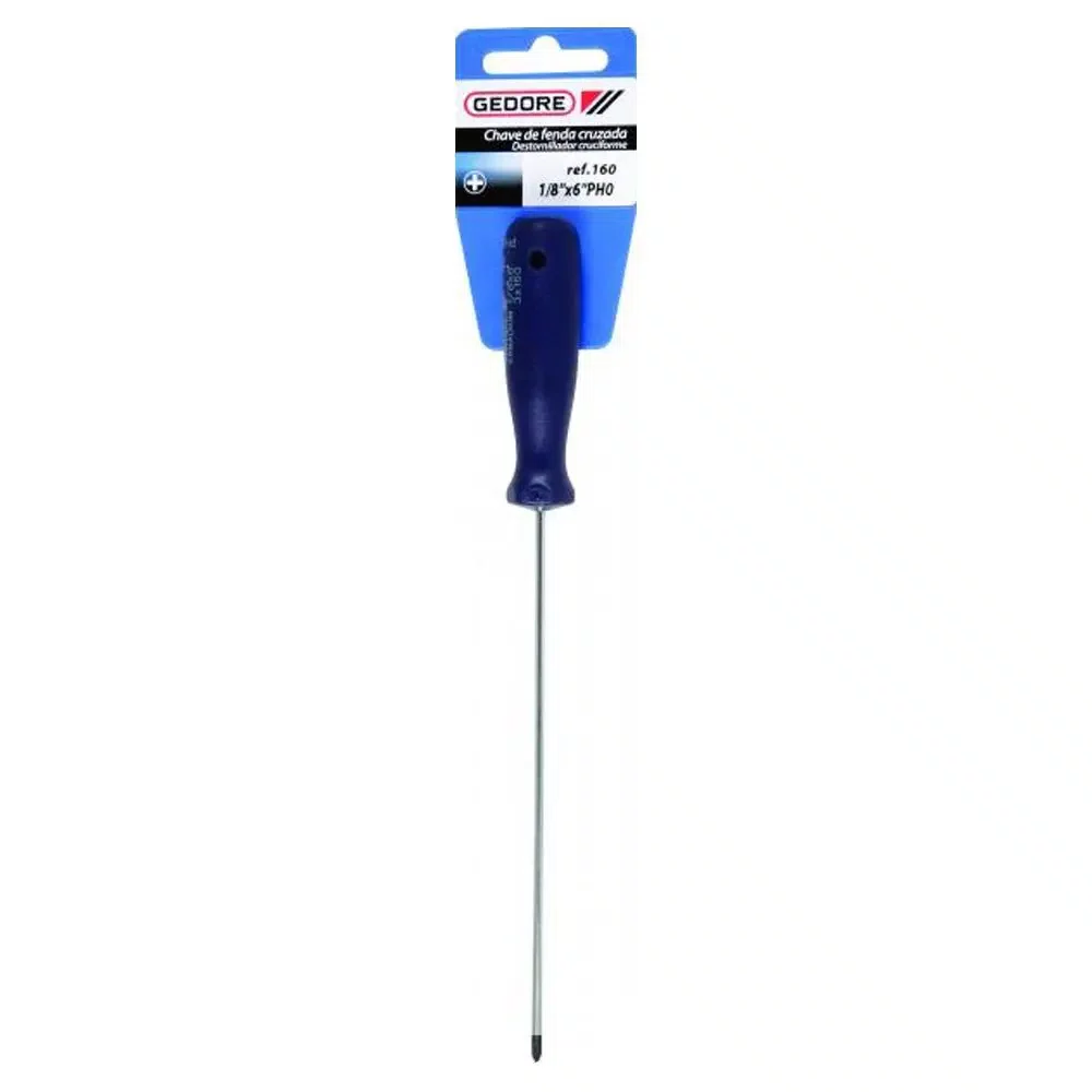 Haste em aço Vanádio e cabo em polímero na cor azul padrão Gedore. Haste com acabamento niquelado e cromado, com ponta escurecida. Cabo ergonômico. Chave com haste redonda e resistente, com perfil de encaixe para parafuso tipo fenda Philips. Encartelada para autosserviço.