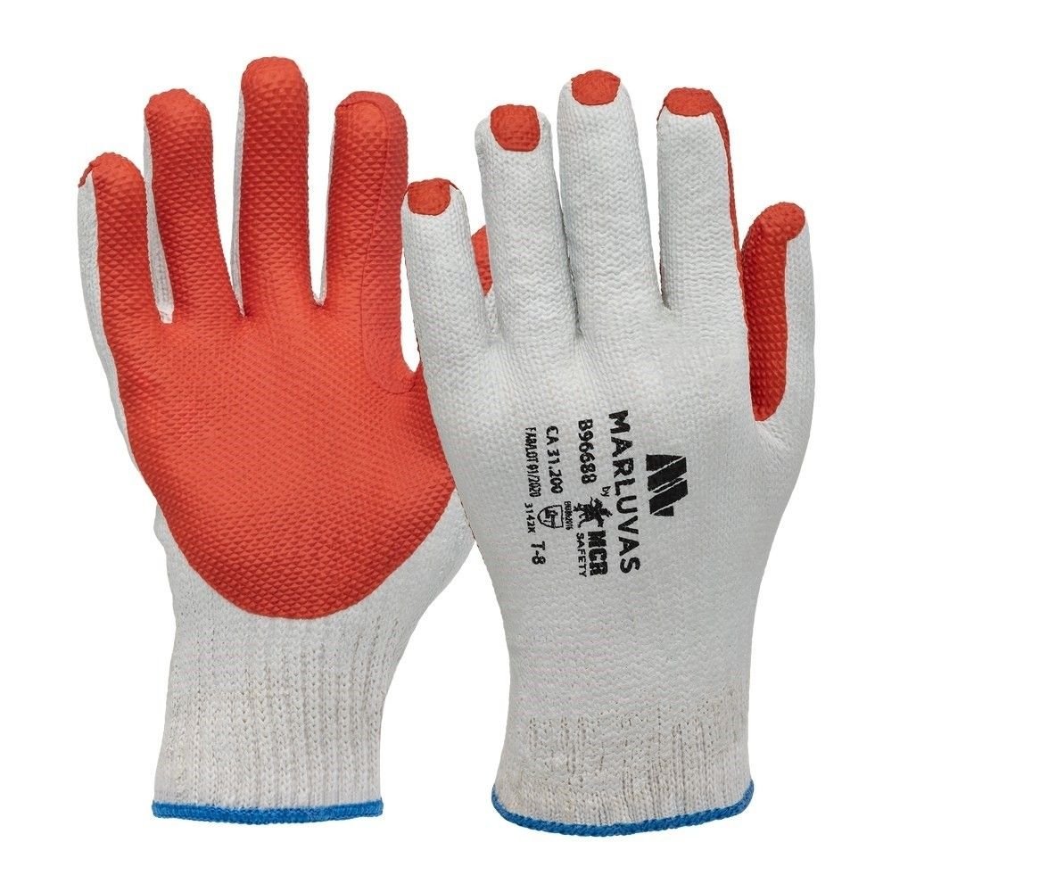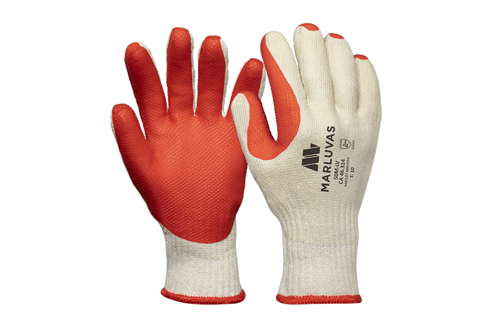 Luva tricotada em malha de algodão, muito confortável para atividades que exijam alta proteção a abrasão. Banhada com borracha natural e uma resistente cobertura texturizada na palma das mãos e ponta dos dedos vulcanizada. Modelagem ergonômica para redução da fadiga muscular. Punho tricotado para evitar a entrada de resíduos sólidos.