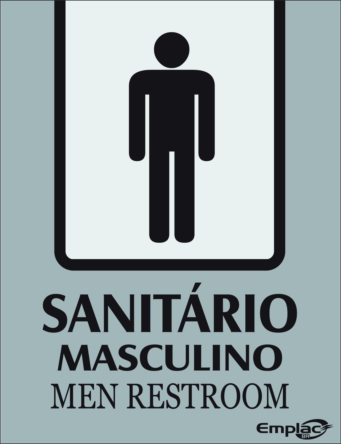 Ideal para empresas, escolas, clínicas, hotéis, aeroportos, comércios e locais públicos. A placa apresenta o pictograma masculino, a inscrição “Sanitário Masculino” e, logo abaixo, a tradução “Men”, promovendo acessibilidade e compreensão universal.