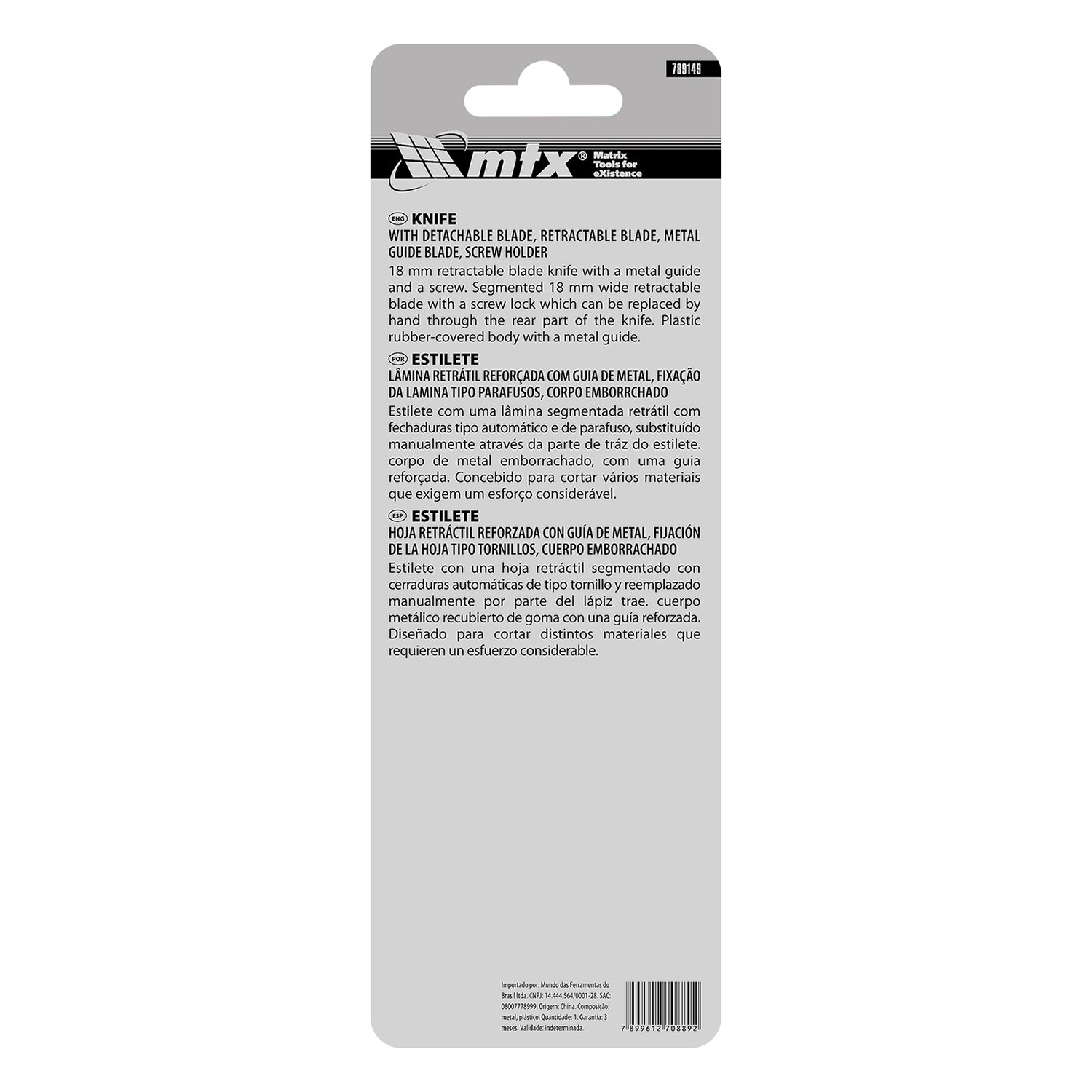 O Estilete MTX 789149 possui lâmina retrátil de 18 mm, com mecanismo de botão giratório para extensão e fixação da lâmina com segurança. Sua construção robusta combina plástico ABS e borracha, oferecendo conforto e aderência firme durante o uso. Ideal para cortes precisos em papelão, papel, couro, linóleo e outros materiais de média dureza.