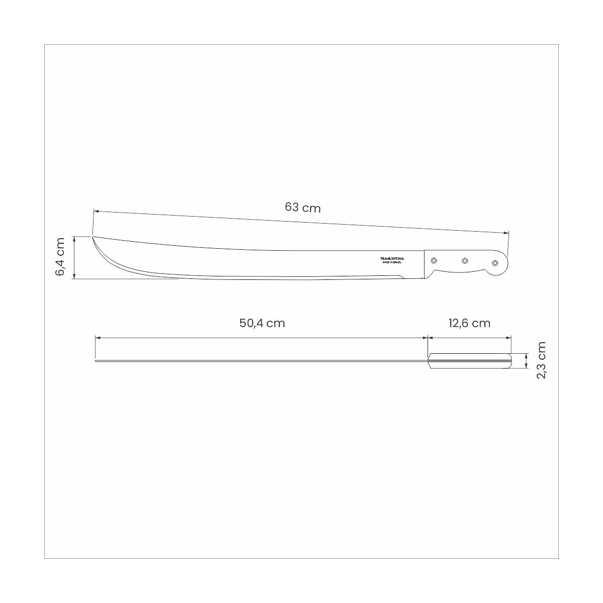 Lâmina de aço carbono com tratamento térmico especial que proporciona maior dureza, resistência do fio e maior poder de corte. Lamina com aplicação de uma camada de verniz como revestimento protetivo, a qual possui a função de proteção durante as etapas de transporte, armazenamento e primeiros usos. Cabo de polipropileno rebitado que garante maior segurança, ergonomia perfeita e conforto no manuseio. Rebites de alumínio. |