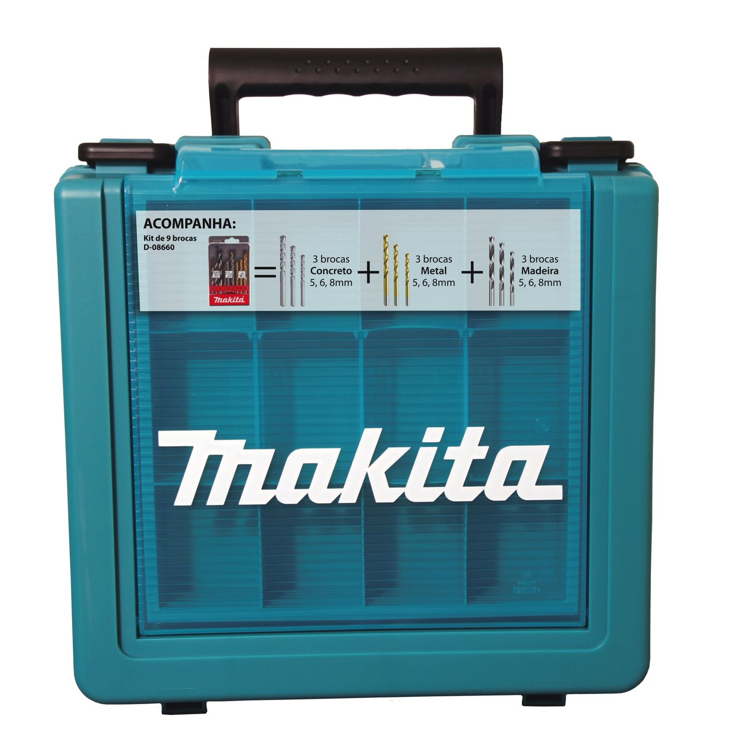 Punho lateral, limitador de profundidade, kit de brocas e maleta.