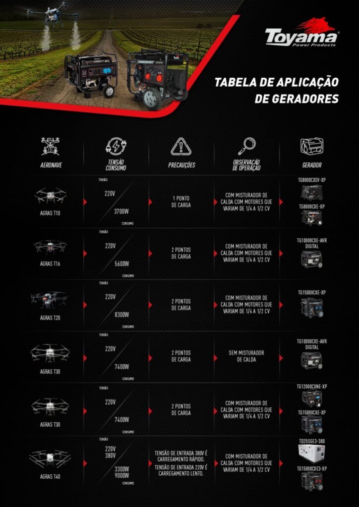 Esse gerador atende às demandas profissionais e é indicado para diversas aplicações, como residências, chácaras, fazendas e estabelecimentos comerciais. Foi desenvolvido especialmente para alimentar os carregadores de baterias do DJI AGRAS T40, mas também pode ser usado para ligar misturadores de caldas, lâmpadas, geladeiras, freezers, ventiladores, televisores, ar condicionado, ferramentas elétricas e outros equipamentos.