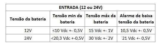 A entrada do inversor é compatível com tensões de bateria de 12V ou 24V, e possui limites de tensão mínima e máxima para garantir um funcionamento adequado. O inversor também possui alarme de baixa tensão da bateria, para alertar quando a carga estiver muito baixa.