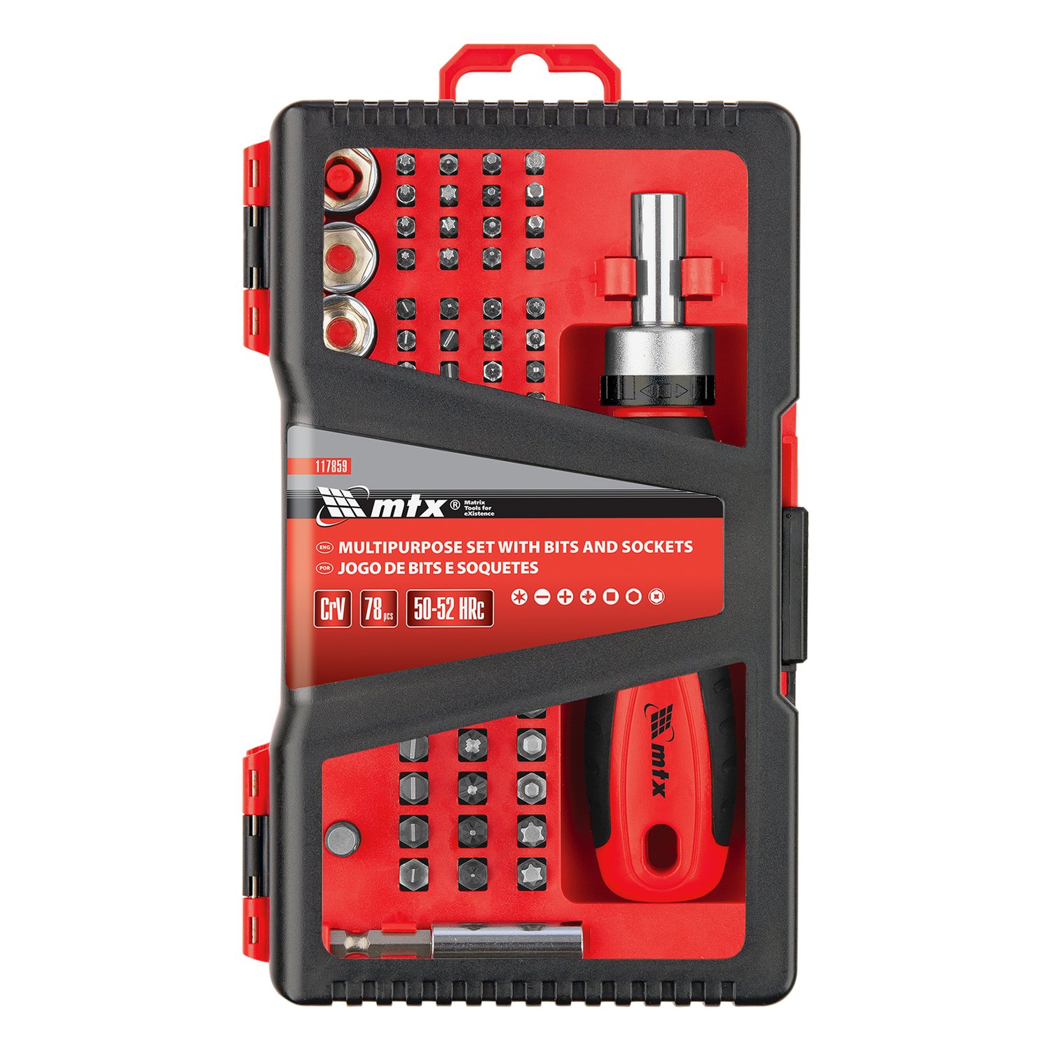 O Jogo Universal MTX 117859 é um kit abrangente e versátil, composto por 78 peças essenciais para todas as suas necessidades de montagem e desmontagem de conexões roscadas. Este conjunto inclui uma chave reversível, adaptadores, suporte para bits, chave de fenda, alicates, magnetizador, bits de diversos tipos e soquetes — tudo para garantir máxima funcionalidade e praticidade em um único conjunto.