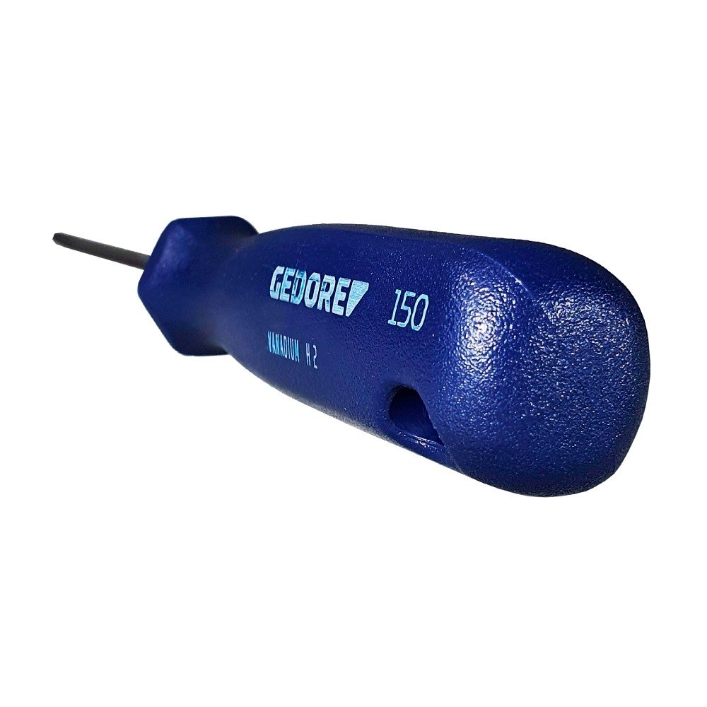 Haste em aço Vanádio e cabo em polímero na cor azul padrão Gedore. Haste com acabamento niquelado e cromado, com ponta escurecida. Cabo ergonômico. Chave com haste redonda e resistente, com perfil de encaixe para parafuso tipo fenda simples e philips. Encartelada para autosserviço.