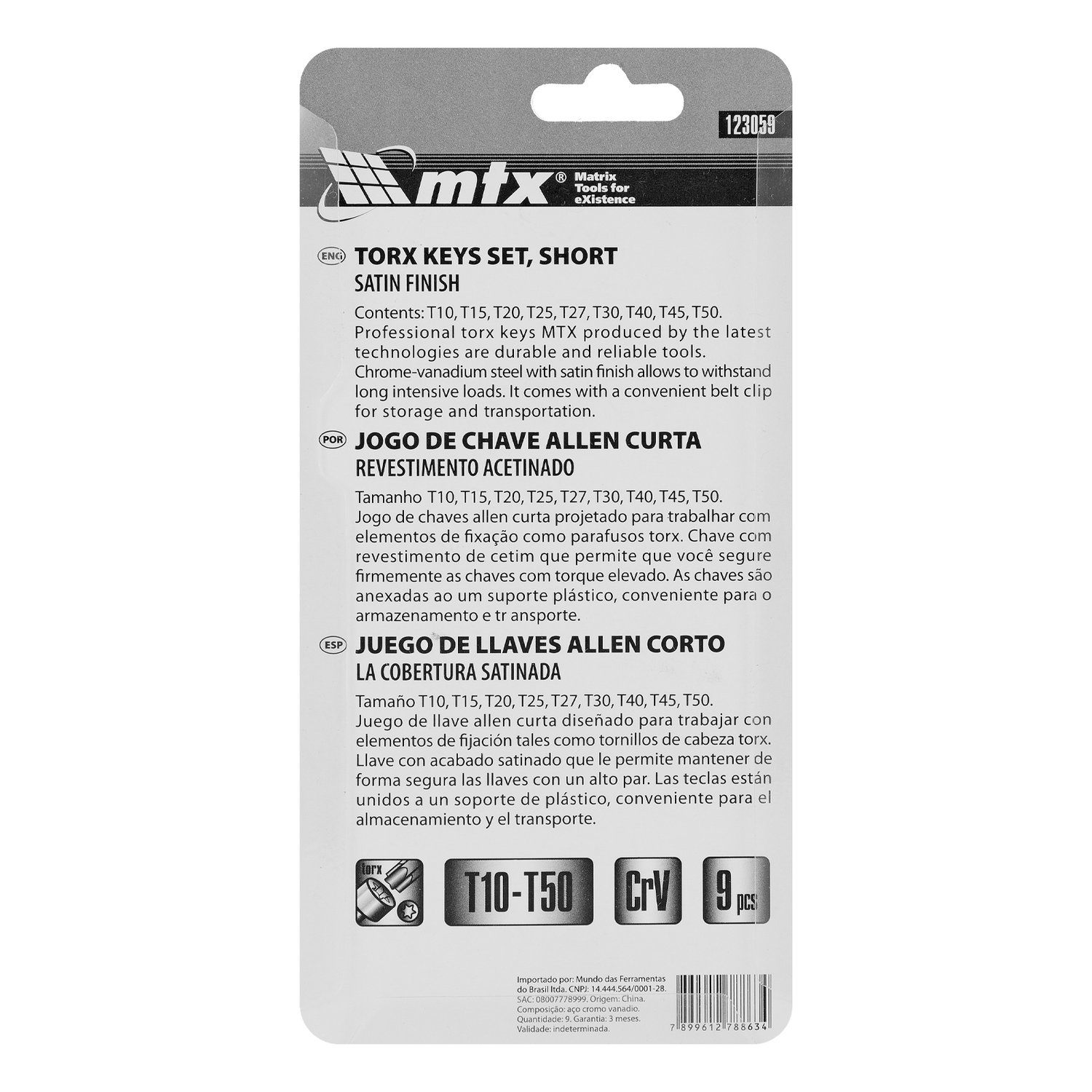9 chaves TORX: T10, T15, T20, T25, T27, T30, T40, T45, T50