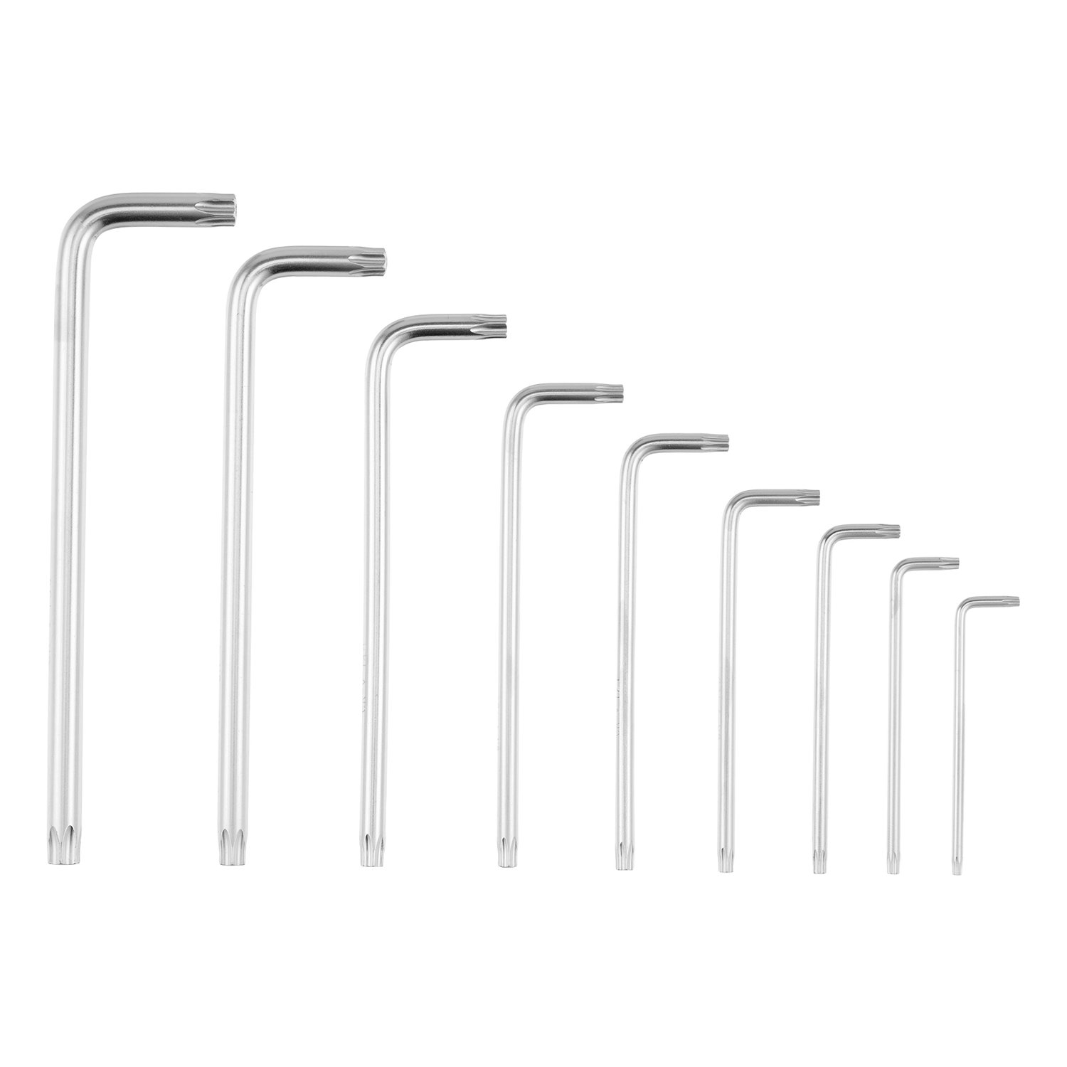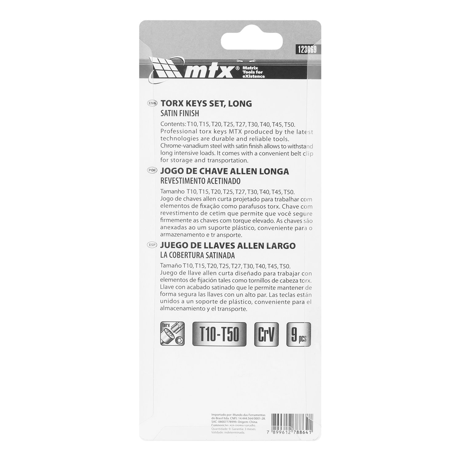 O Jogo MTX 123069 é composto por 9 chaves TORX longas, com perfis de T10 a T50, fabricadas em aço cromo-vanádio (CrV) de alta resistência. Com acabamento acetinado e formato em “L”, cada chave possui duas extremidades de trabalho, ideais para alcançar parafusos em locais de difícil acesso.