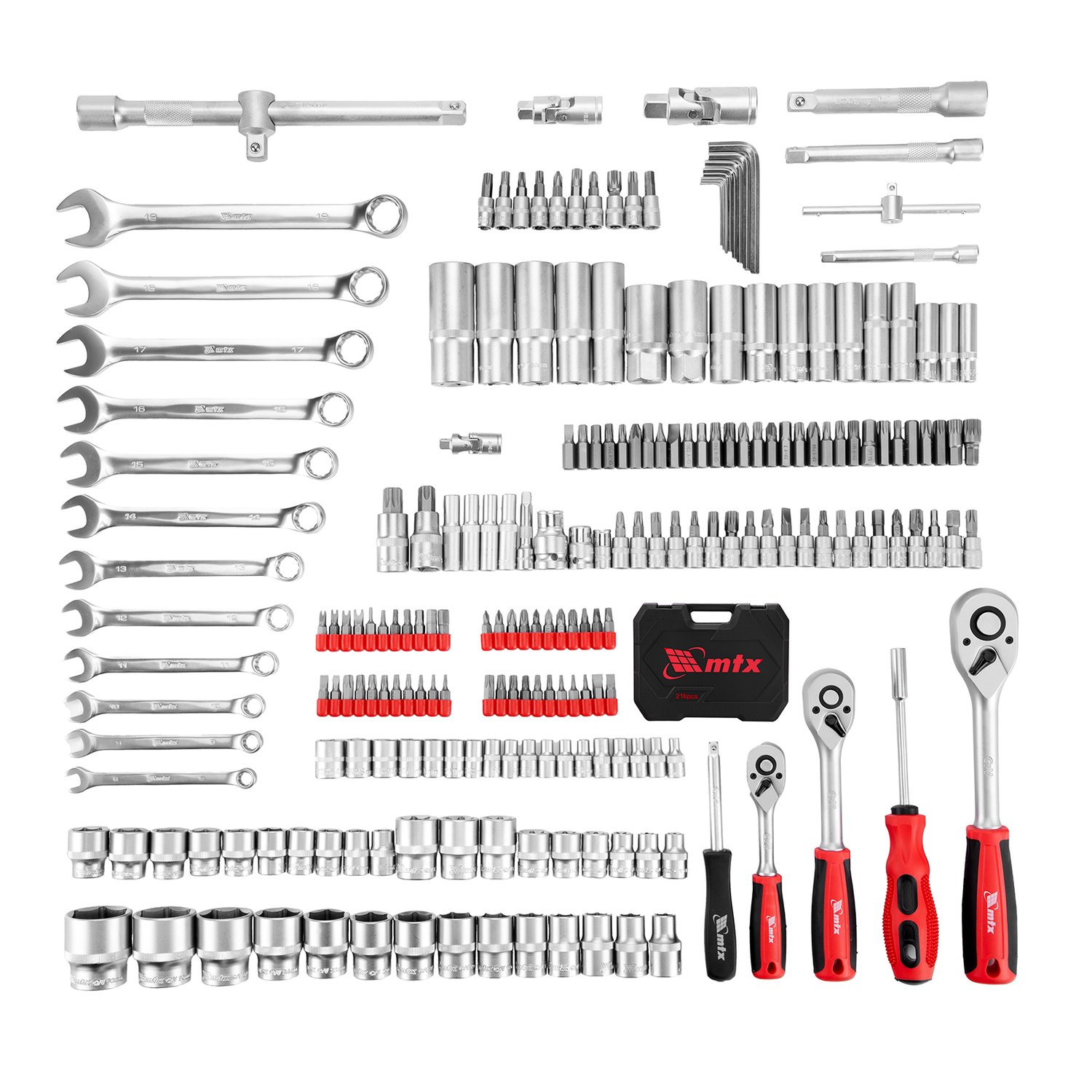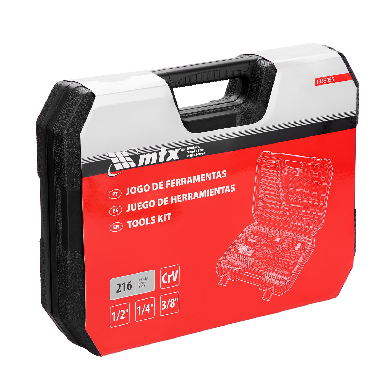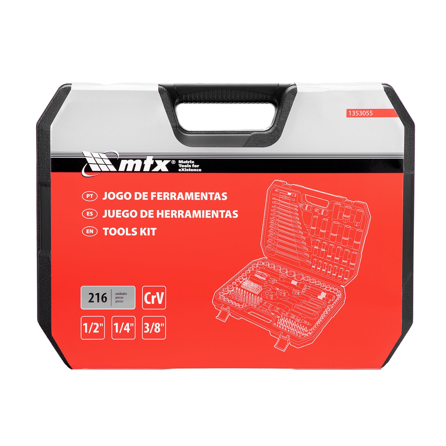 O Jogo de Ferramentas MTX 216 Peças é ideal para profissionais da mecânica, manutenção industrial ou uso doméstico. Com medidas de encaixe de 1/4", 3/8" e 1/2", o conjunto inclui catracas, soquetes, chaves, extensores e adaptadores em uma maleta plástica resistente com travas metálicas, garantindo mobilidade e proteção.