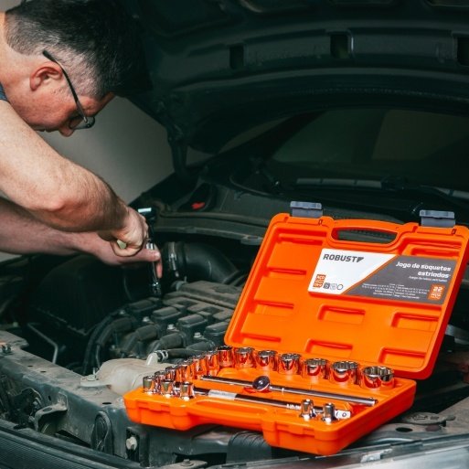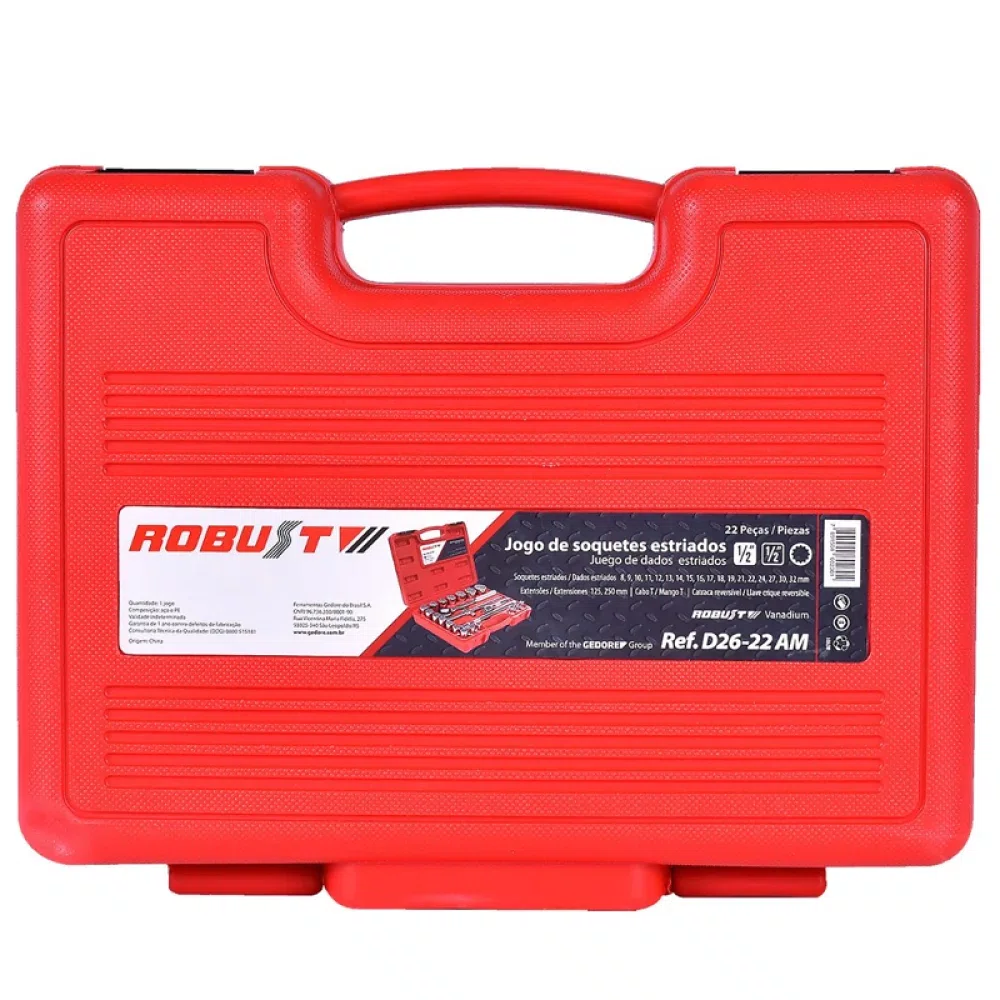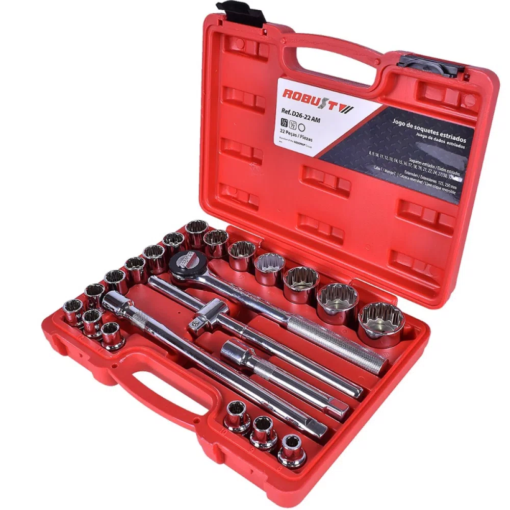 O “22 Peças” é o jogo compacto e prático da linha Robust, que reúne os soquetes e acessórios mais utilizados em mecânica geral, manutenção e reparos! É Versátil. É Compacto. É Imprescindível.