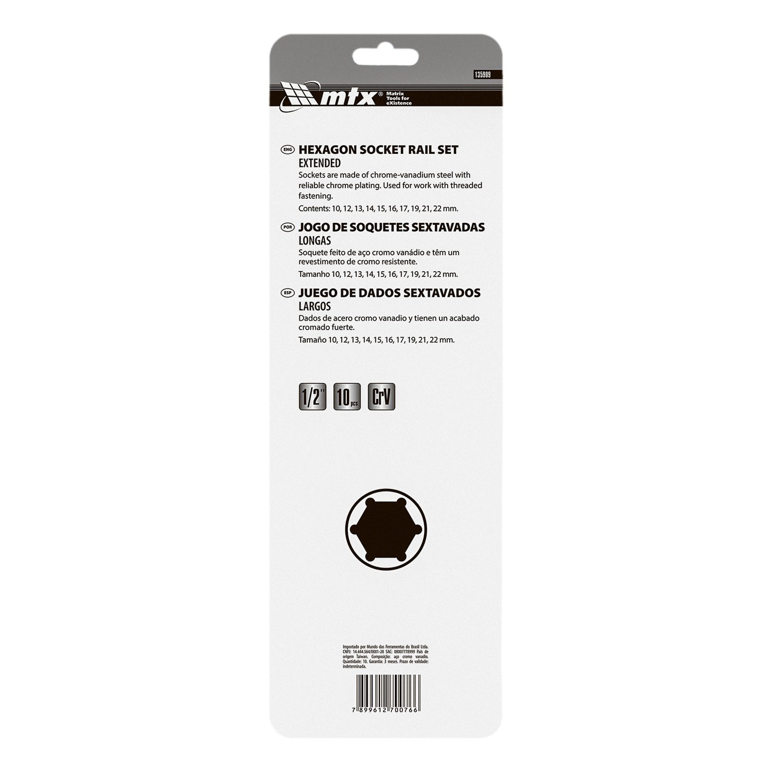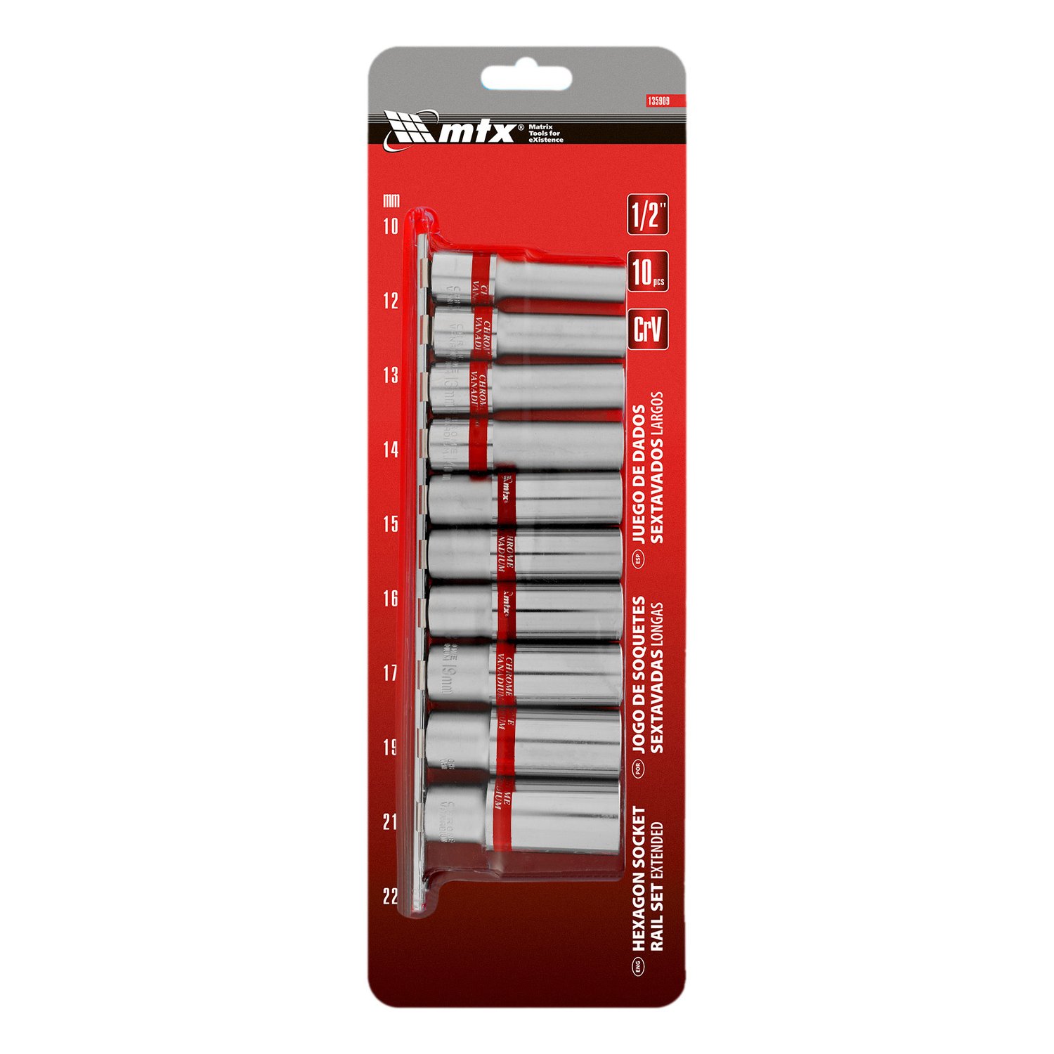 O Jogo de Soquetes MTX 135909 é a escolha ideal para quem busca eficiência, alcance estendido e robustez no aperto e desaperto de fixadores. Composto por 10 soquetes sextavados de 6 pontos, com medidas de 10 a 22 mm, este conjunto é projetado com encaixe quadrado de 1/2" e fabricado em aço cromo-vanádio (CrV), garantindo alto desempenho tanto em oficinas mecânicas quanto em uso doméstico.