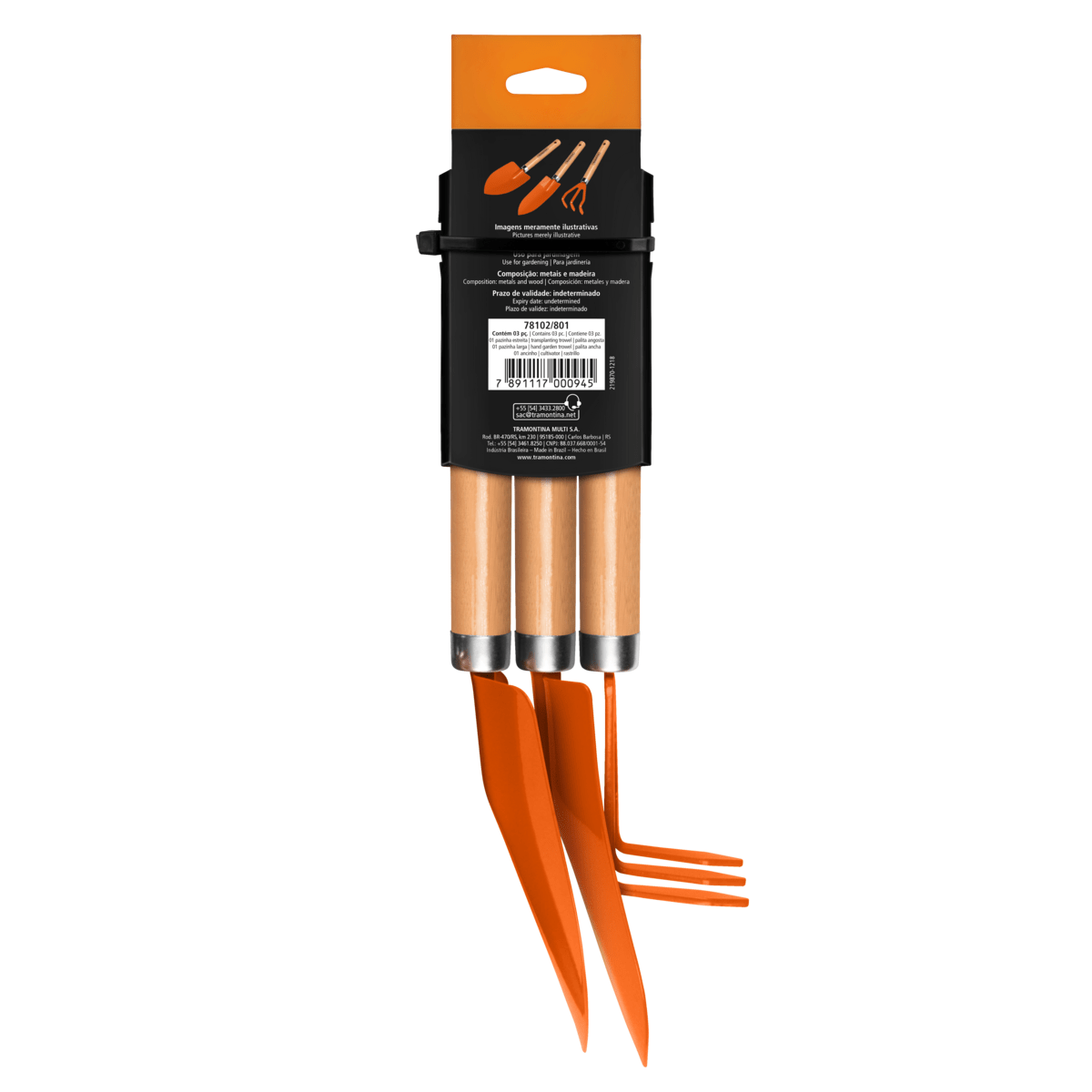 Informações Gerais | - As ferramentas são fabricadas em aço carbono especial de alta qualidade. - Recebem pintura eletrostática a pó, que tem uma melhor apresentação visual e maior proteção contra oxidação. - Os cabos destas ferramentas, além de possuírem ótima resistência, são produzidos com madeira de origem renovável. - Cabos com acabamento envernizado, para um melhor acabamento e apresentação do produto. A camada protetora em verniz incolor realça sua tonalidade, concedendo brilho e um toque mais liso ao produto. - Produtos leves, que geram menos esforço físico do usuário e tornam o trabalho mais prazeroso. - Contém 3 peças: 1 pazinha larga (77907/001), 1 pazinha estreita (77908/001) e 1 ancinho 3 dentes (77909/001). - A embalagem tem por finalidade facilitar a exposição do produto no ponto de venda. |