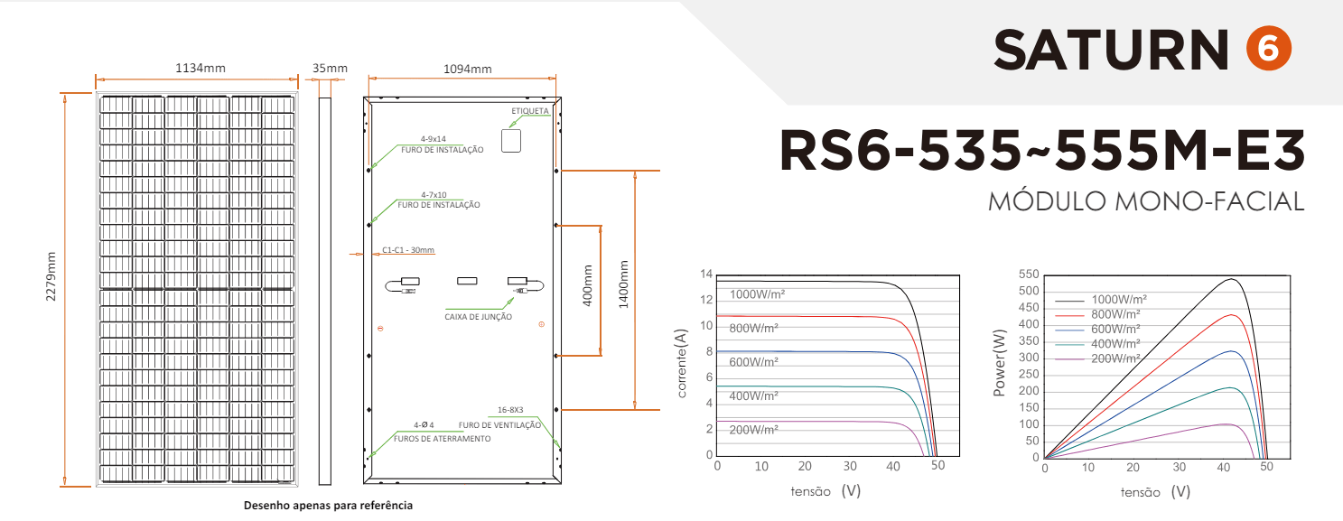 O painel solar RS6-555MG-E3 é um módulo fotovoltaico monocristalino monofacial com potência máxima de 555W, adequado para usinas de solo e projetos de geração distribuída. Este módulo é parte da série RS6-535~555M-E3, que oferece uma eficiência de módulo superior e uma tolerância de energia positiva de 0~+3%.