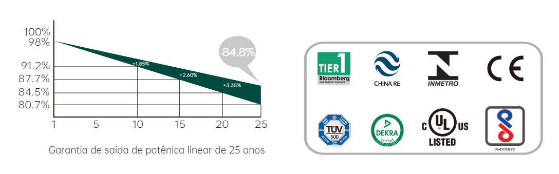 Este painel solar combina tecnologia avançada e materiais rigorosamente selecionados para garantir desempenho superior e confiabilidade a longo prazo, com certificações completas do sistema e do produto IEC, sendo ideal para uma ampla gama de aplicações de energia solar.